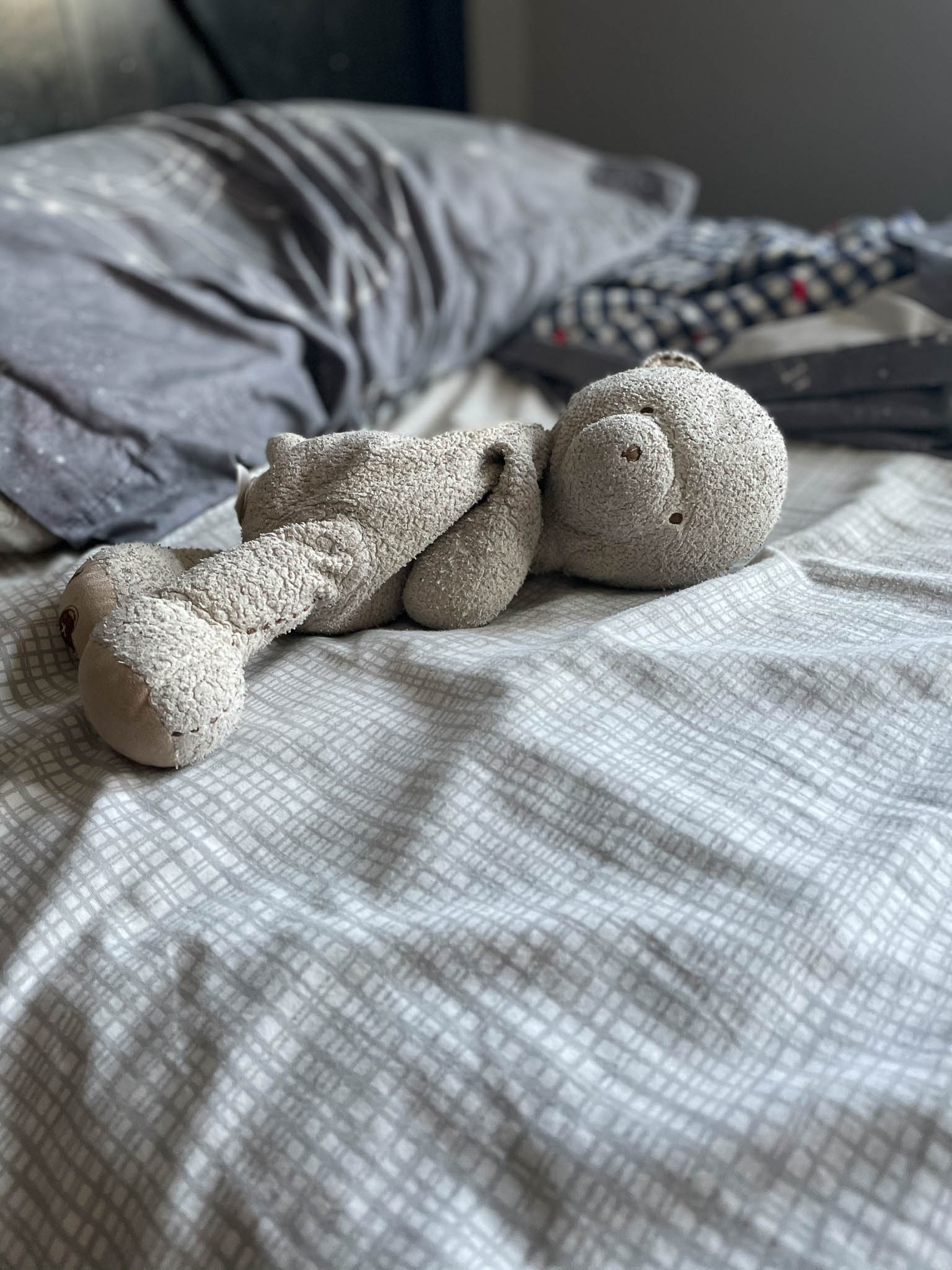 The truth is, in the ten years that my son has taken comfort in Mr. Bear, he has changed. He has a couple of tucked-away stitch marks near his neck where a hole formed (for the record, Mom isn’t the world’s best sewer.) Additionally, over the years, some multi-colored lint has attached itself to bear’s fur that makes him not quite white anymore—more like grayish-white.